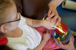 Na zajęciach z logopedą i pedagogiem Julcia dużo wokalizuje, Pani logopedce udało się nawet uzyskać „la,la,la” co Julci bardzo się spodobało 🙂 Terapeutki kontynuują też wprowadzoną przez Panią Agnieszkę u nas na miejscu wokalizację „aaa” w odpowiedzi na „tak” o której pisałam wcześniej.
