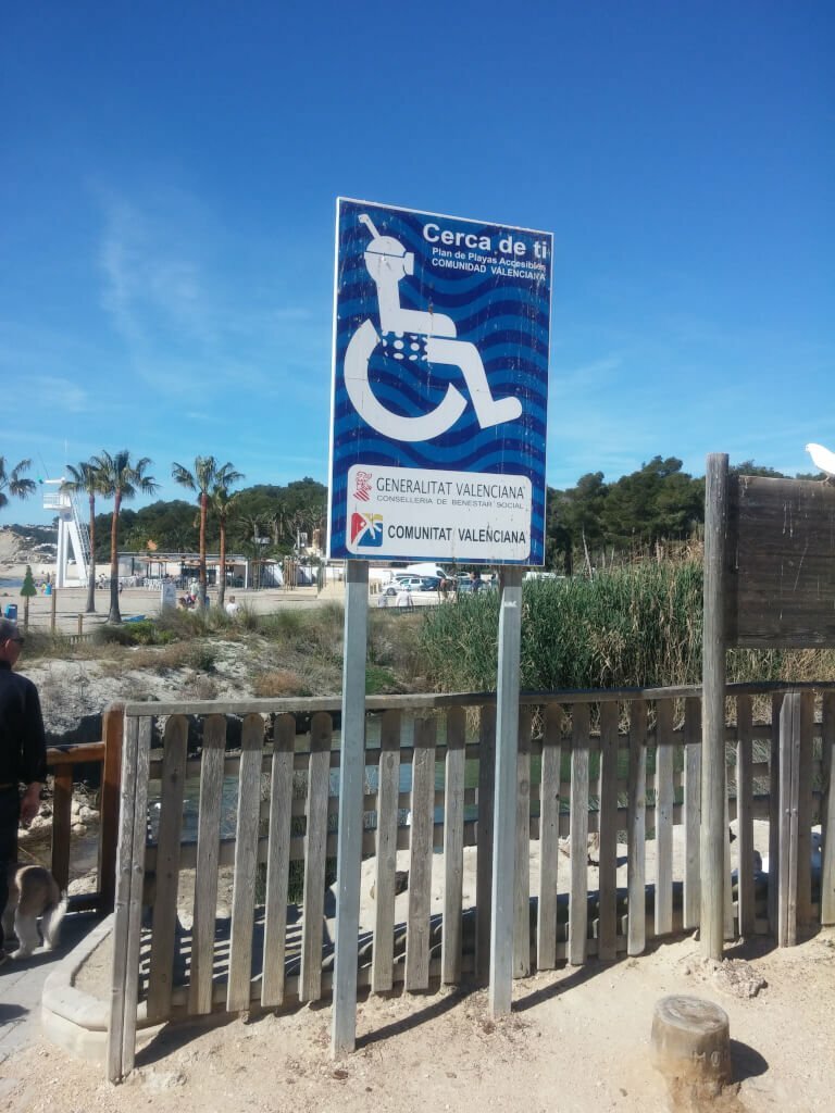 Dostępność-bardzo emocjonalnie nacechowane słowo dla osób związanych z jakąkolwiek formą niepełnosprawności. Sama często łapię się na tym, że oceniam dane miejsce przez pryzmat dostępności właśnie. Podczas spaceru po promenadzie przy plaży w urokliwym nadmorskim hiszpańskim miasteczku Moraira, natknęliśmy się na znak, który mnie rozbroił po prostu 🙂 Znak powszechnie znany jako symbol niepełnosprawności, ale w zupełnie nowej dla mnie odsłonie, lekko nawet z humorem, choć mówiący o poważnych rzeczach. Nie znam hiszpańskiego, ale zakładam, że chodzi o dostępność dla osób niepełnosprawnych plaży i kąpieliska. W jak daleko idącym zakresie nie wiem – nie sprawdzałam, ale wygląda obiecująco 😉