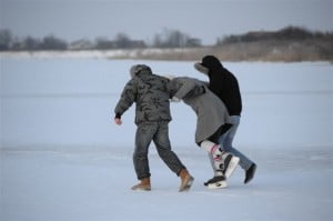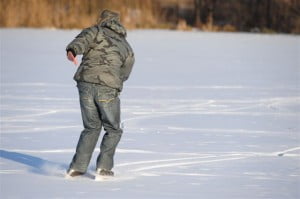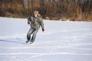 Ponieważ staw był cały ośnieżony i ciężko było jeździć, poszliśmy kawałek dalej na Nogacik – rzeczkę taką niedaleko płynącą, bardzo mocno zamarzniętą.