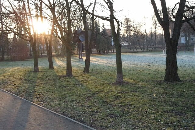 Cienie drzew razem z wschodzącym zza nich słońcem malują trawniki w jasno – ciemne pasy i naprawdę widok jest nieprzeciętny.